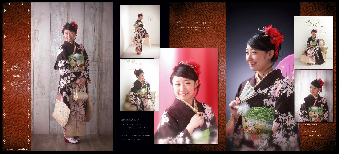 成人用写真台紙(アルバム)も豊富にご用意しております。着物の色や柄にあったものをセレクトされることをおすすめいたします。