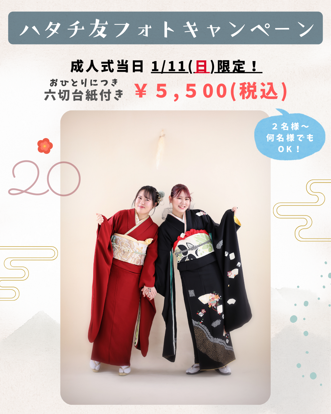 一生に一度。記念にお友だちと!5,500円(税込)×人数で六つ切(ほぼA4)サイズの写真(台紙付き)とデータが全員分!